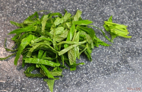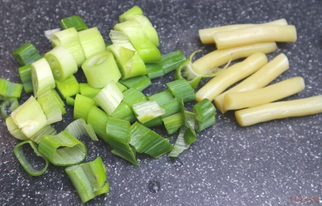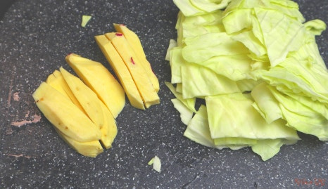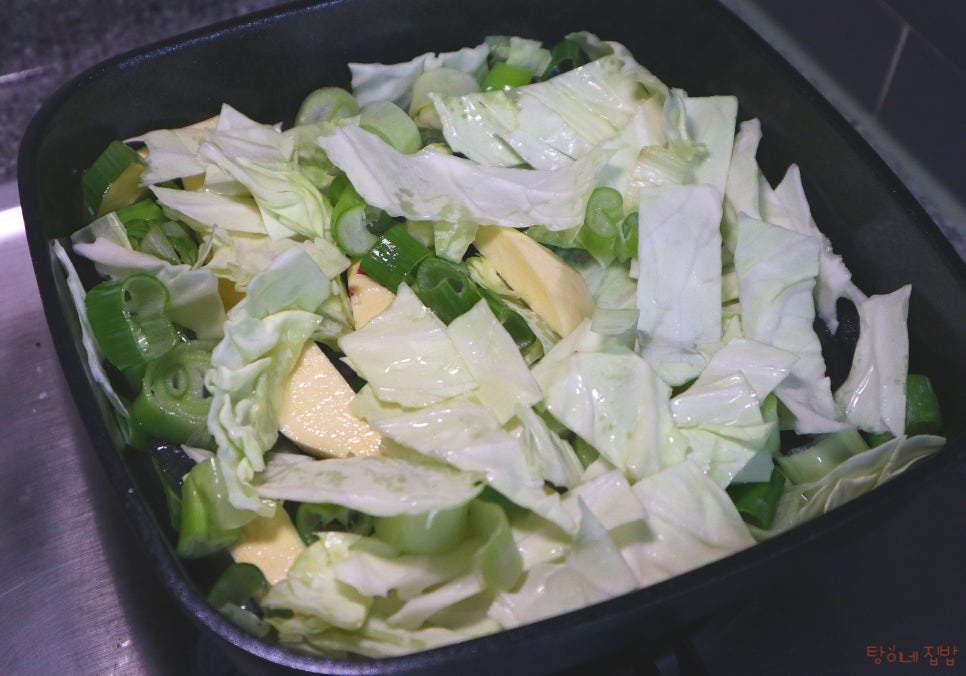 고구마 1개 (작은 거) 양배추 100~150g 대파 15cm1개 떡사리 5~7개 깻잎 7장