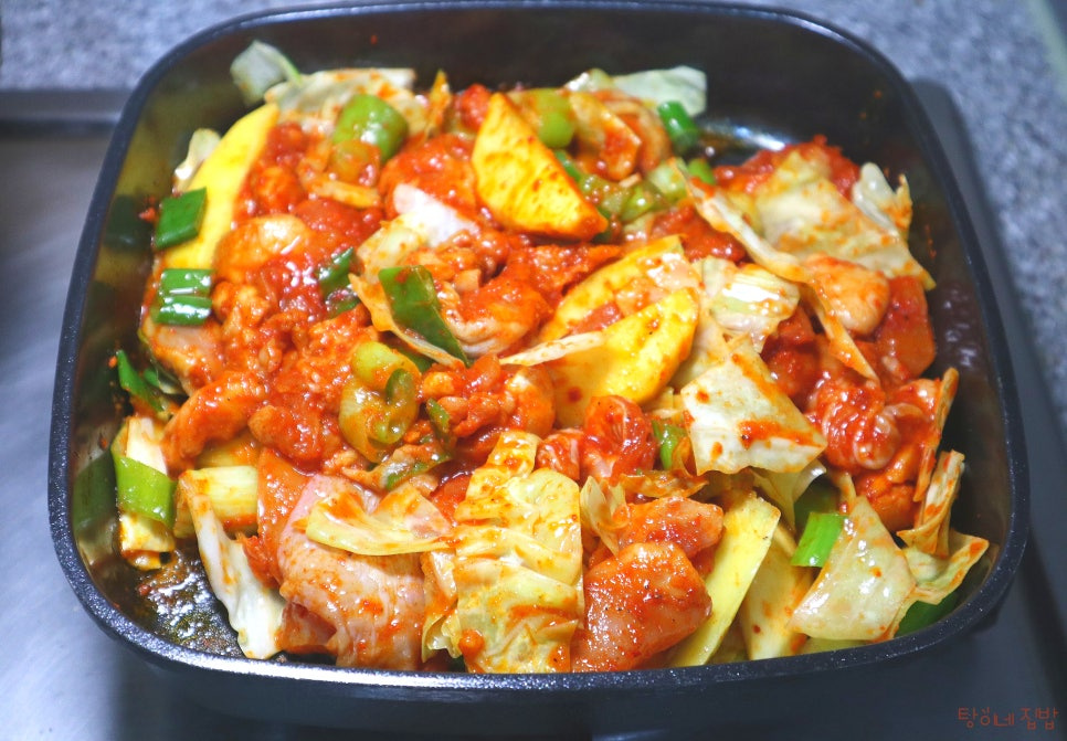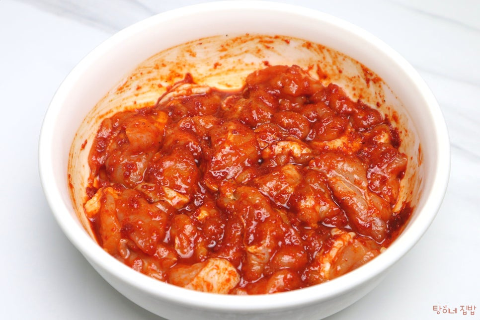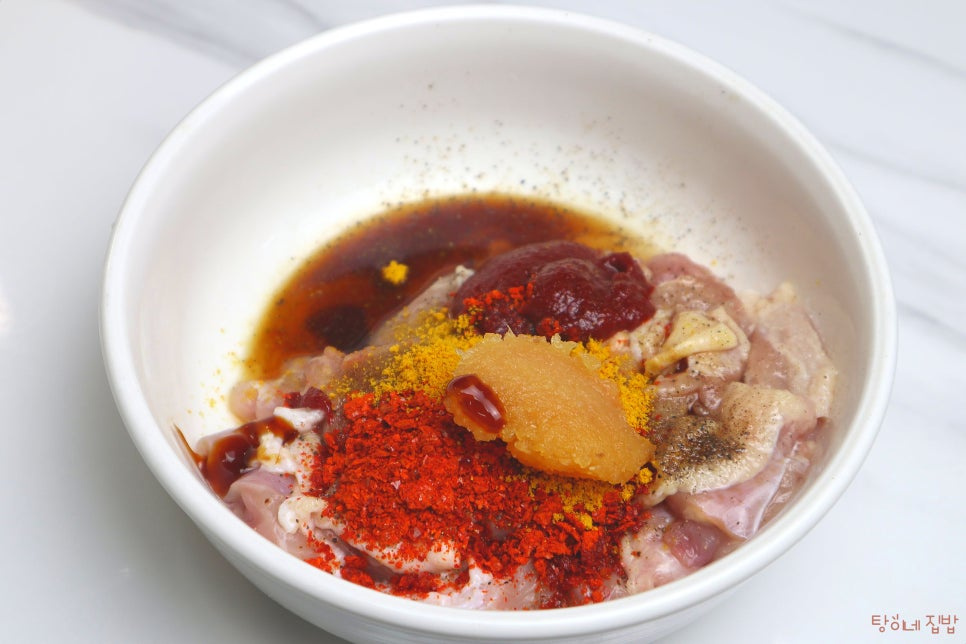 양조간장 2T 고추장 2T 맛술 3T 고춧가루 2T 다진 마늘 1T 설탕 2T 갈아만든 배 3T 카레 가루 0.5T 굴 소스 0.5T 후춧가루 소량