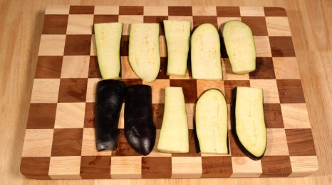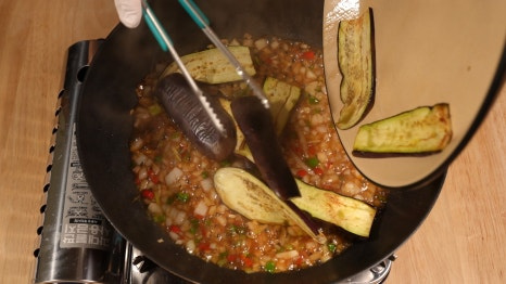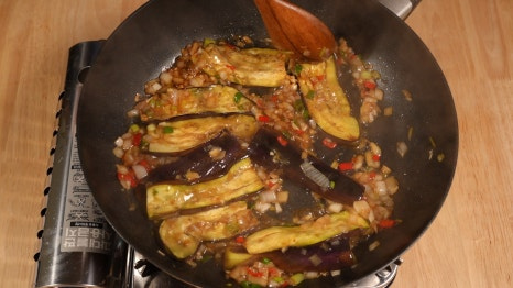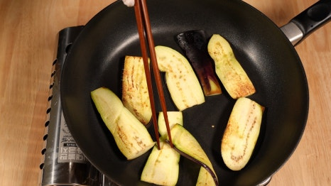 중약불로 달궈지면 가지를 올려 노릇하게 앞 뒤로 구워줍니다.