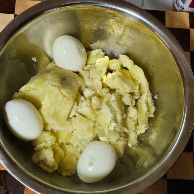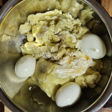 으깬 고구마, 삶은 달걀 3개, 마요네즈 3T, 꿀 3T, 소금후추 약간