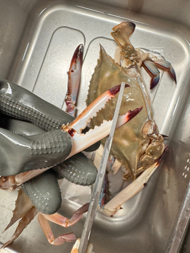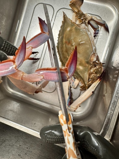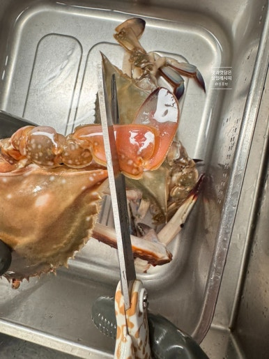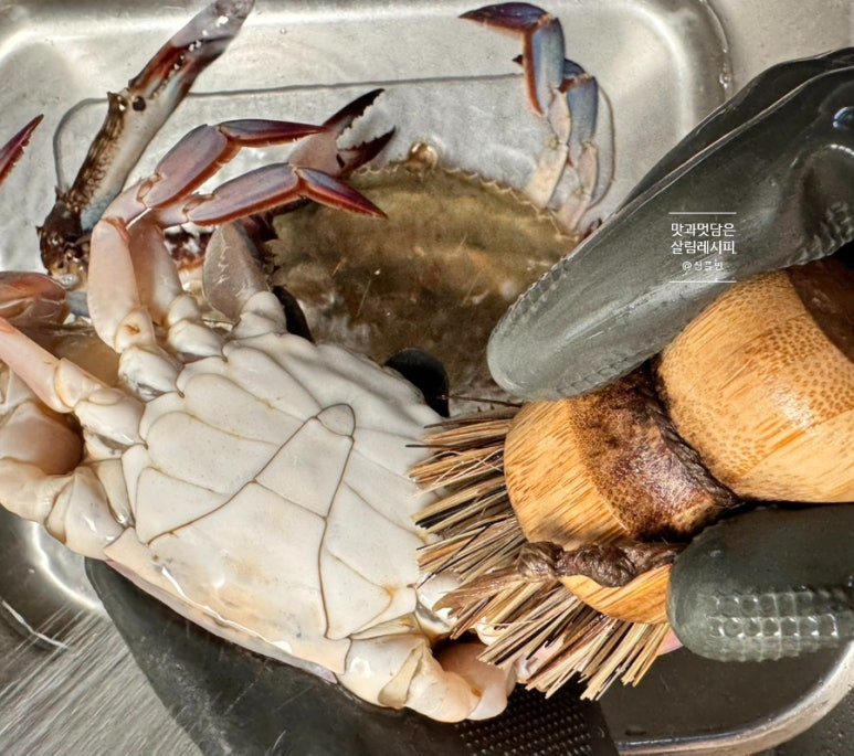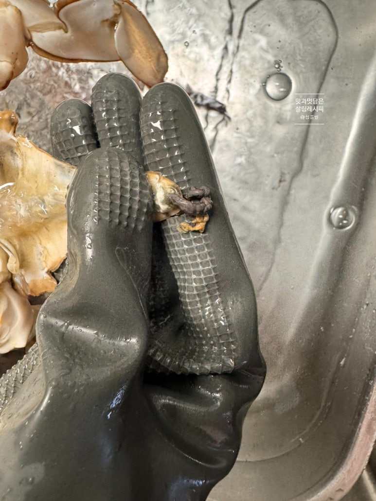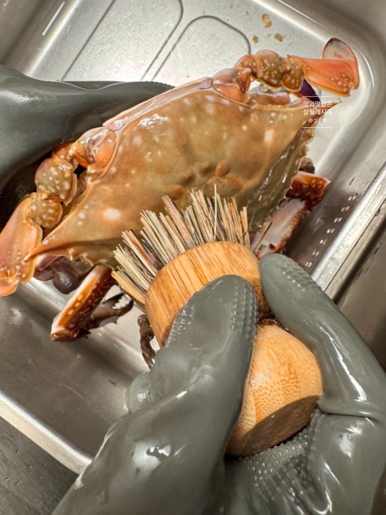 흐르는 물에서 먼저 톱밥을 비롯한 이물질들을 깨끗하게 씻어주었어요. 위와 같이 배 부분을 보아 뾰족한 부분의 모양을 하고 있으면 수게랍니다. 배 부분을 비롯하여 등딱지 부분까지 솔로 문질러가면서 깨끗하게 세척해 주세요.