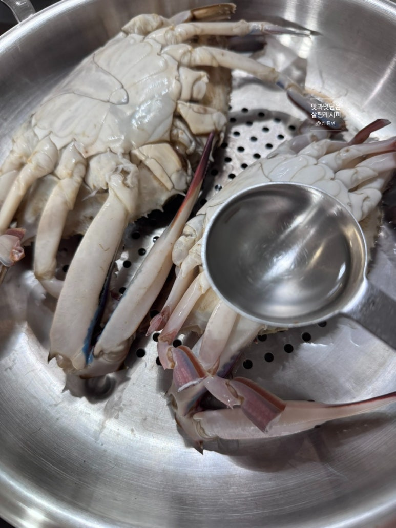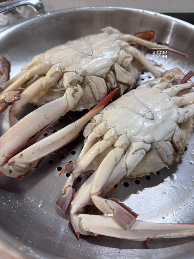 이제 뚜껑을 닫고 중불상태에서 15분 익혀주는데요. 2~3마리의 중 사이즈 기준이기 때문에 게의 크기가 클 경우엔 18분까지 시간을 늘려주도록 합니다. 너무 오래쪄도 살의 수분이 빠지고 마를 수 있기에 적당한 시간 맞춰서 익혀주세요. 다음 불을 끄고 5분간 뜸을 들여주면 완성입니다.