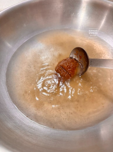 물 2컵 분량인 400ml 정도 넣고요. 된장 한 큰술 정도를 넣고 보글보글 끓여줍니다.