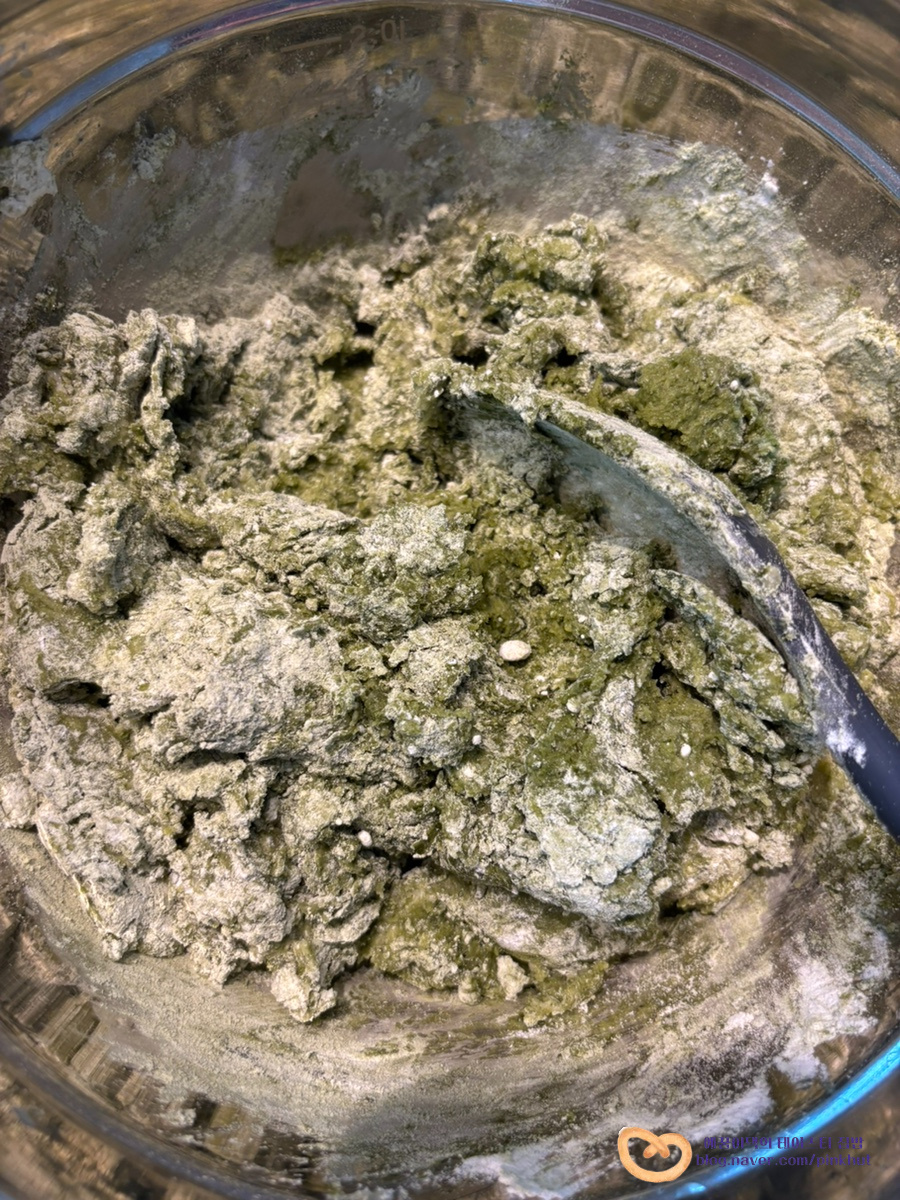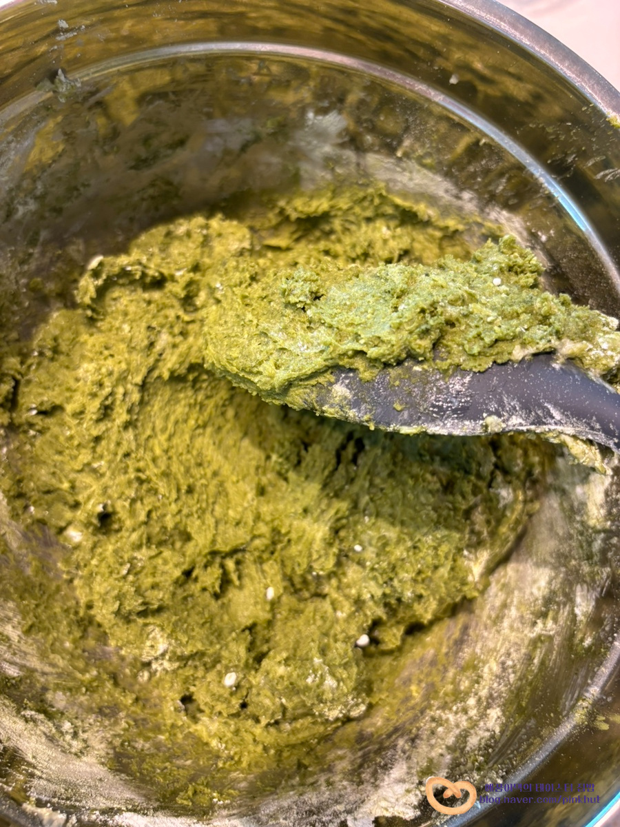 박력분 160g, 옥수수전분 7g, 베이킹소다 2g을 채에 쳐서 반죽에 넣어주세요 말차가루 15g을 넣고 골고루 섞어주세요.