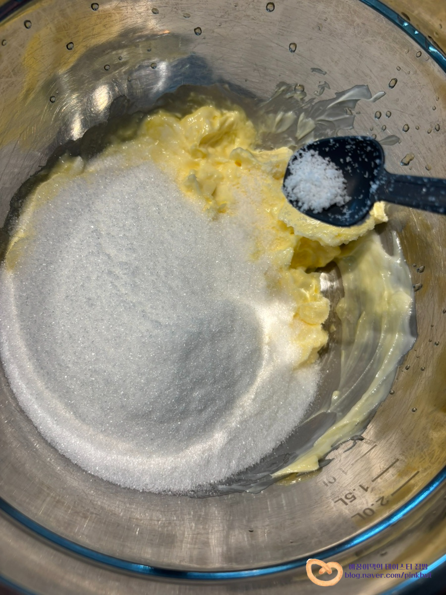 흰설탕 140g, 소금 2g을 넣고 골고루 섞어주세요