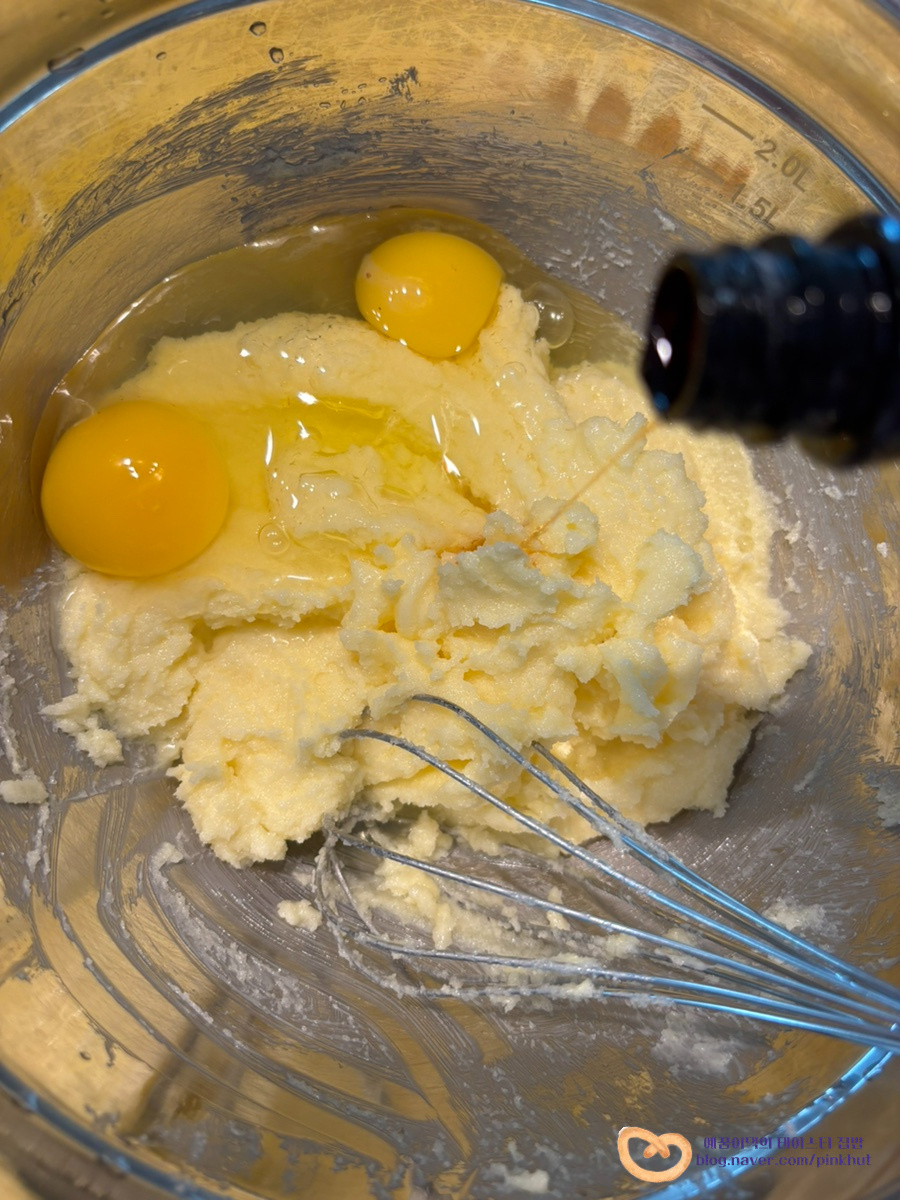 실온에 둔 달걀 1개 톡 깨서 넣고 바닐라익스트랙 2g을 넣어주세요. 바닐라 익스트랙은 달콤한 향을 내고 계란 비린맛을 제거하는 역할을 해요 거품기로 골고루 섞어주었어요. 계란의 양이 많을 때는 계란을 2~3번에 나눠서 넣으면 더 수월하게 섞을 수 있어요