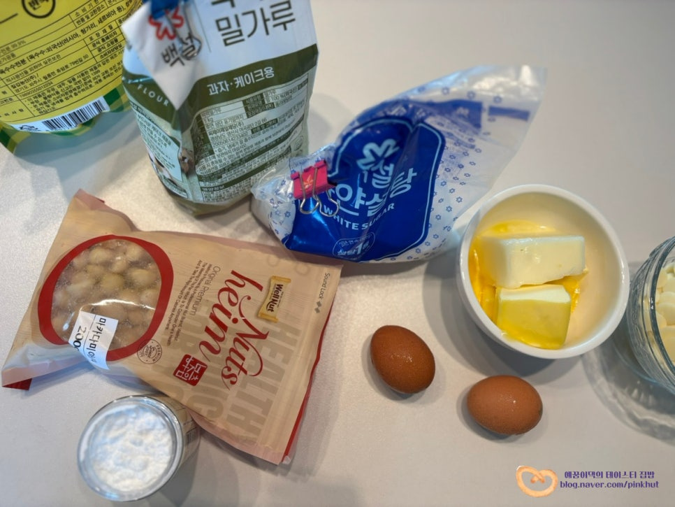마카다미아 60g 중 40g은 반죽에 넣고 나머지 20g은 굽기 전에 토핑으로 올려줄 거예요. 그 외 쿠키 구울 때 사용하는 밀가루 종류인 박력분, 맛있는 식감과 부풀기를 조절해 줄 옥수수전분, 베이킹소다 등을 준비하면 재료 준비 끝!