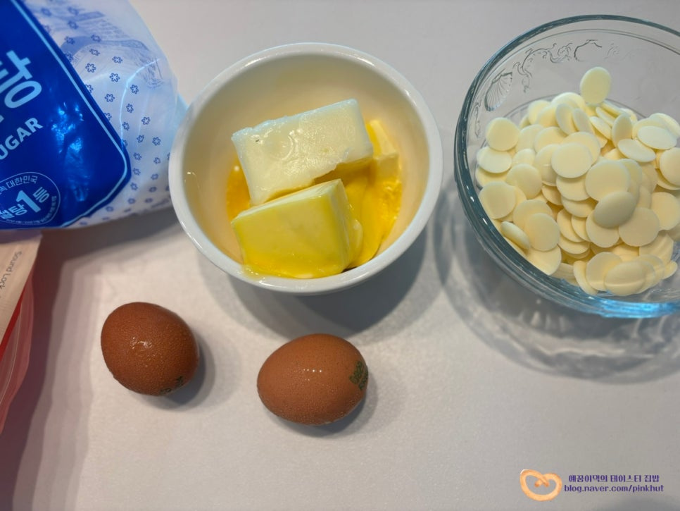 화이트초콜릿 커버춰는 80g을 준비했어요. 초코칩을 사용하셔도 되는데 커버춰가 풍미가 더 좋고 맛있어요 :) 너무 크면 반으로 쪼개서 사용하시면 됩니다
