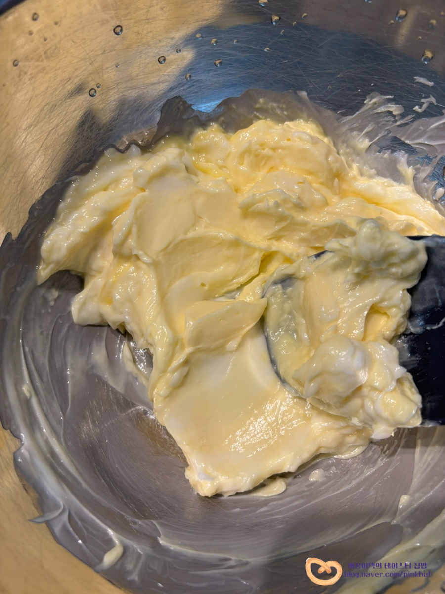 믹싱볼에 무염버터 130g을 넣고 부드럽게 풀어주세요. 사진처럼 말랑하게 풀어졌으면