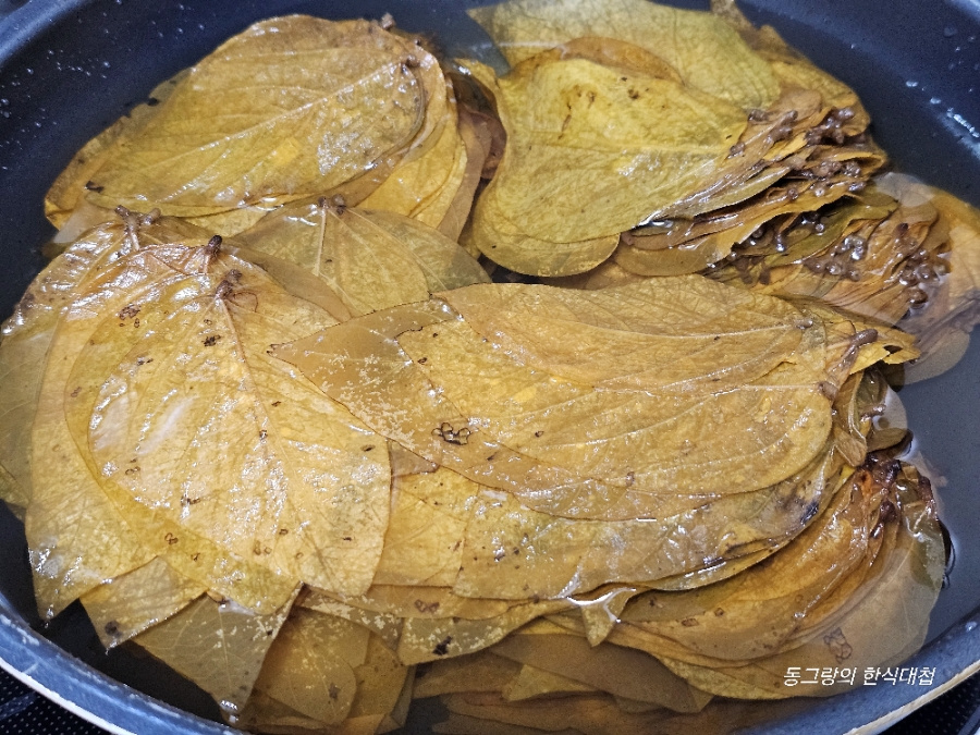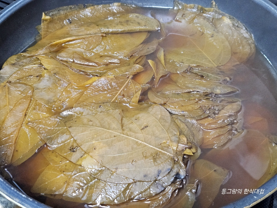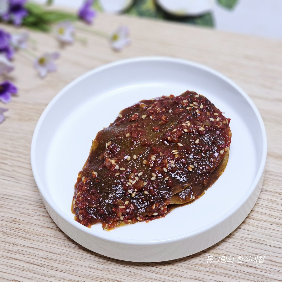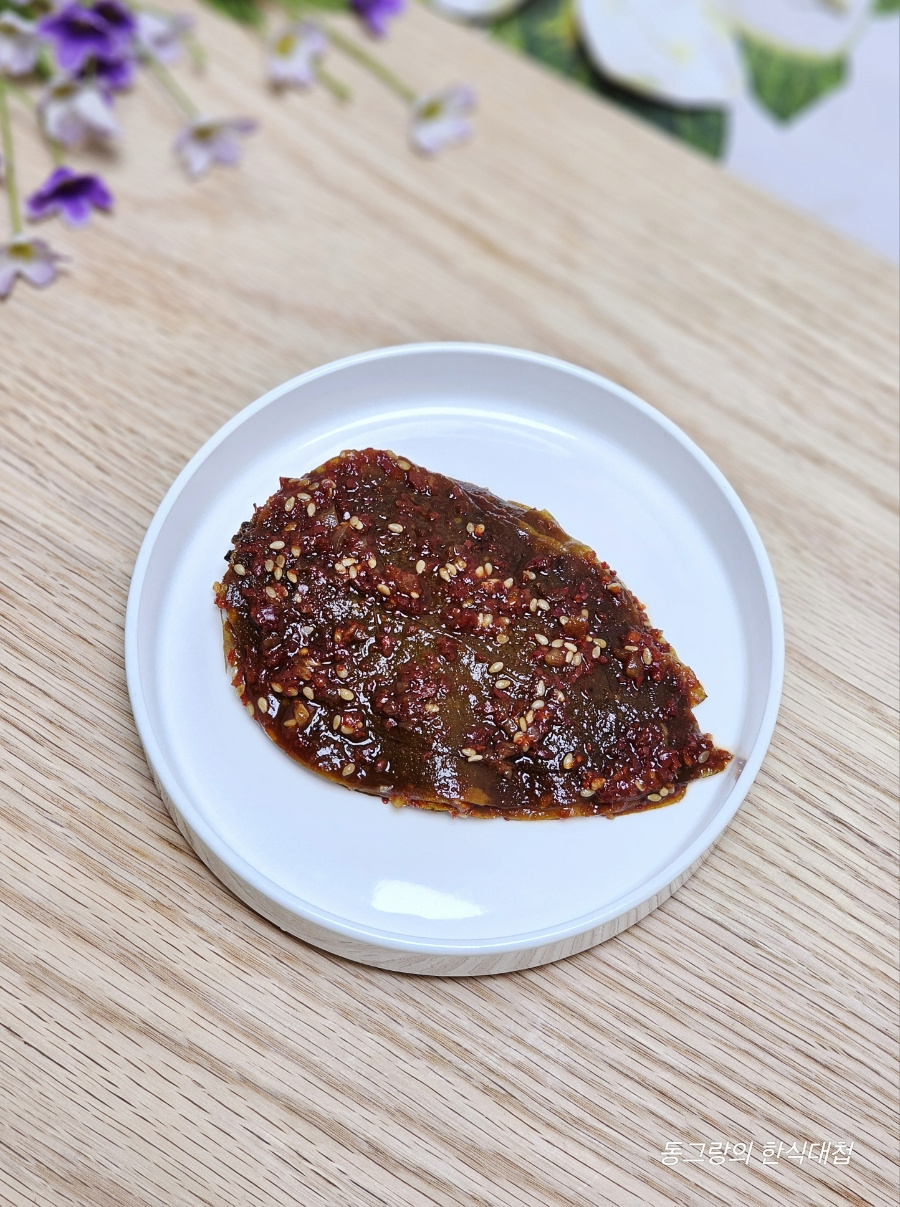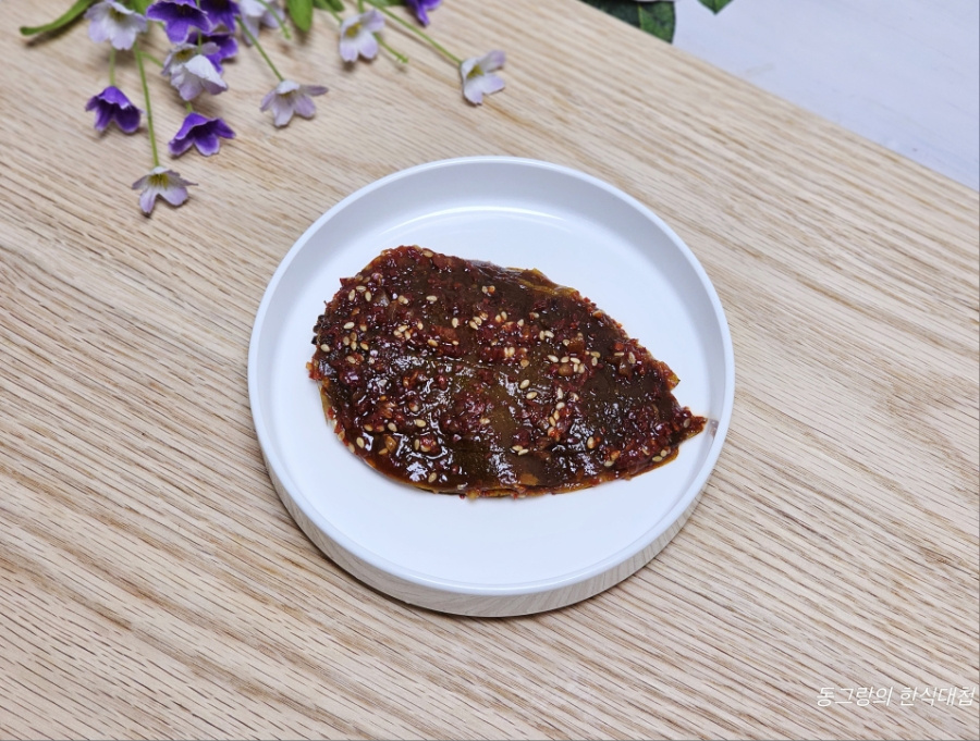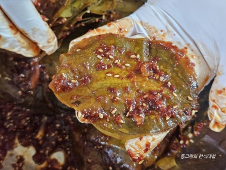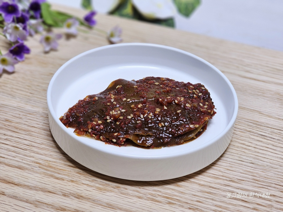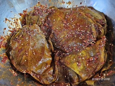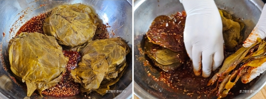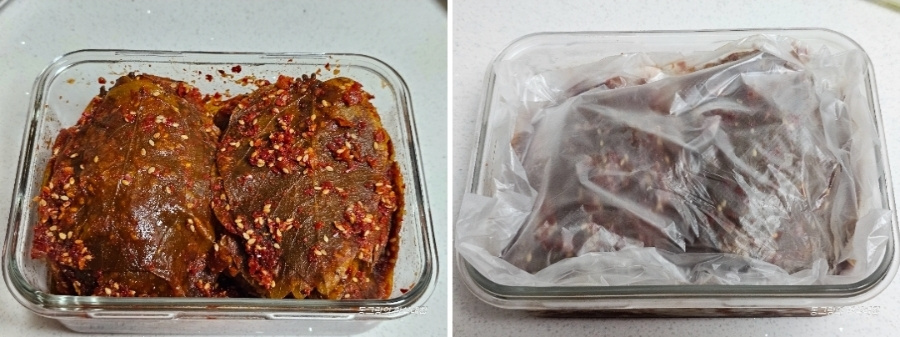한 장씩 꼼꼼하게 바를 필요 없이 4, 5 장 사이에 양념이 발려지도록 하면 포개 두었을 때 바르지 않은 잎에도 간이 잘 밴답니다