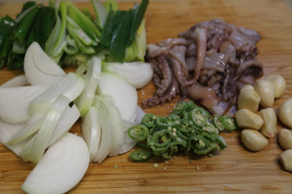 오징어 1마리, 양파 1개, 대파 1대, 청양고추 2개, 통마늘 한줌