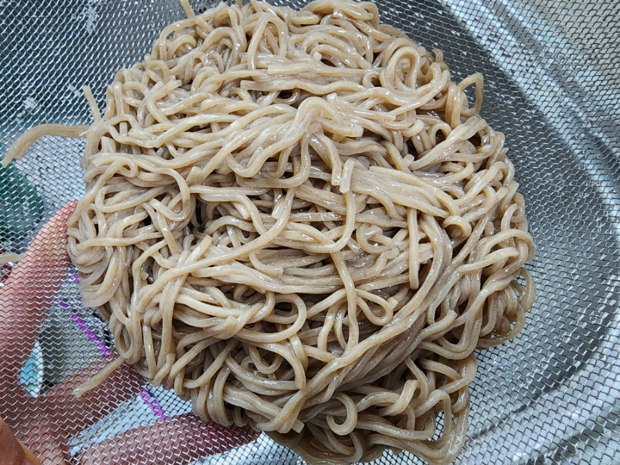 다 삶아진 면은 물에 헹궈주며 전분기를 빼주고 채반에서 물기를 제거해 줍니다
