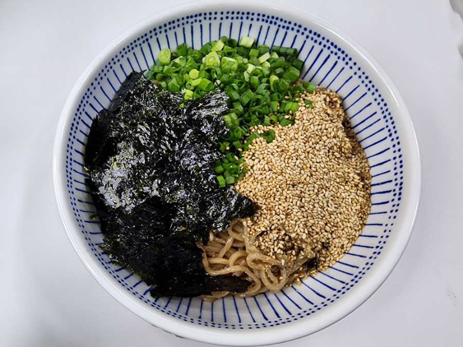 버무린 국수를 우동기에 담아낸 뒤 고명으로 쪽파, 통깨, 김가루를 올려줍니다