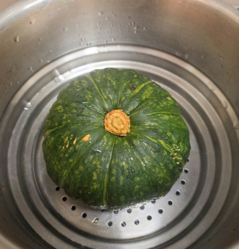1. 단호박 찌기 - 10분 찐 후~뒤집어서 3분 정도 더 찌기. (강불)