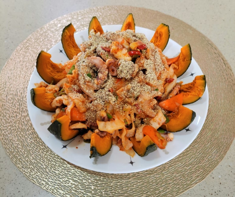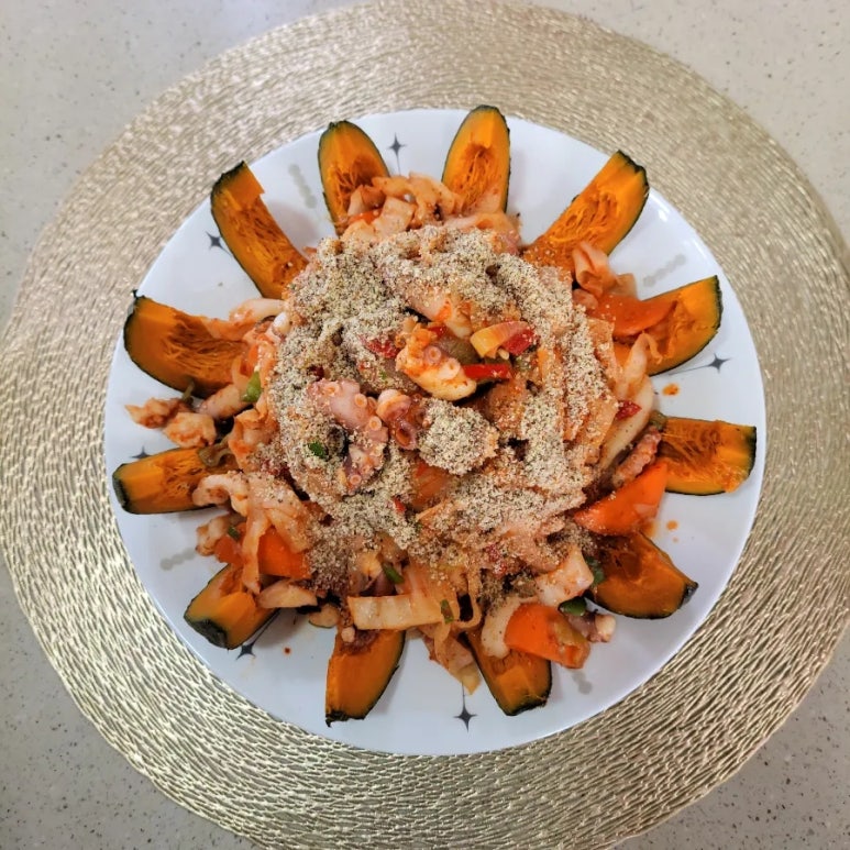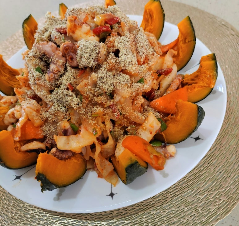 19. 찐 단호박 위에 볶은 낙지 올리고, 들깨가루 듬뿍 뿌려서 완성하기.