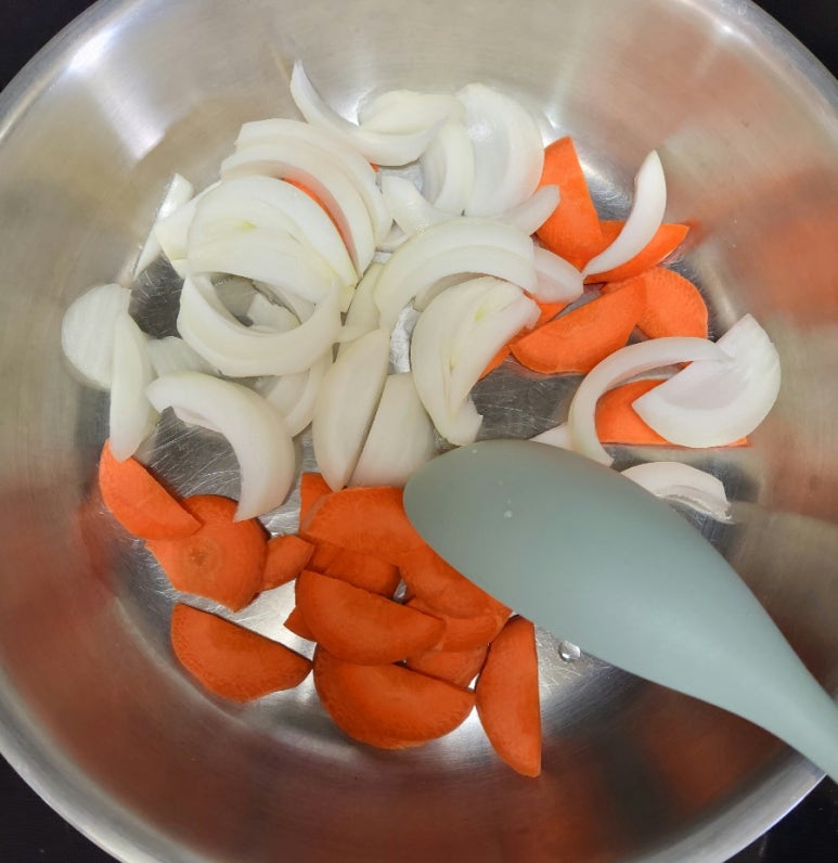 12. 달군 팬에 오일 살짝 두르고, 당근, 양파 넣고 볶기. (중불, 3분)