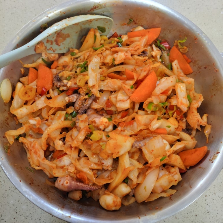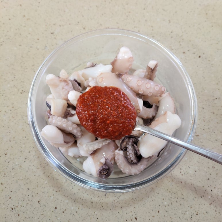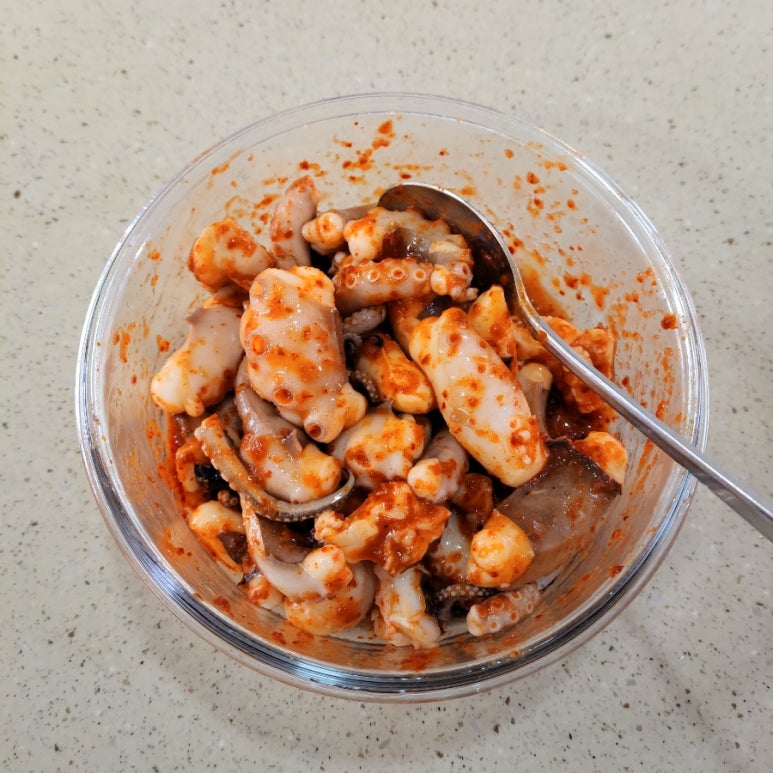 10. 데쳐둔 낙지는 양념에 버무려두기.