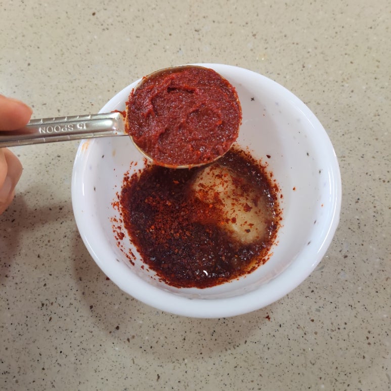 4. 양념장 만들기- 양조간장 1T, 고추장 1T, 고춧가루 1T, 다진 마늘 1T, 소주 1T(맛술)