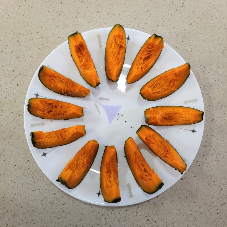 11. 단호박 썰기 - 미리 찐 단호박은 씨를 제거하고, 먹기 편한 크기로 작게 나눠 썰고~ 넓은 접시에 담아두기. (낙지를 양념에 잠시 절이는 시간에~)
