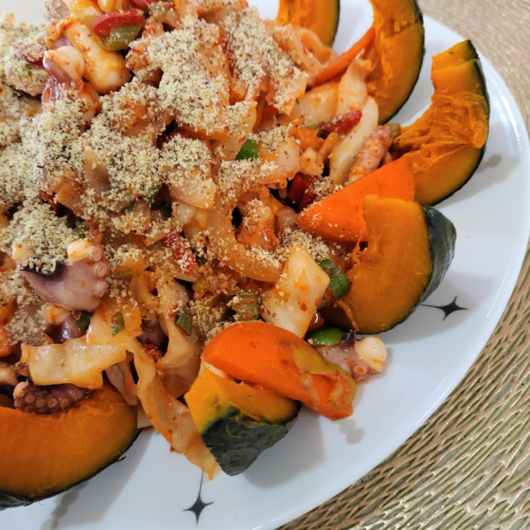 매콤한 낙지볶음은 부드럽고 달콤한 단호박과의 콜라보도 기대이상의 맛입니다. 치즈 대신~ 들깨가루를 듬뿍 뿌려 고소한 풍미를 살린 " 매콤, 낙지 품음~ 달콤, 단호박찜"입니다. 짜지 않고 심심하게 만들면, 그냥 먹어도 한 끼 식사로 충분하고, 간이 적당하면 통곡물 밥과 곁들여도 좋습니다. 단호박의 달콤함과 들깨가루의 고소함이 매운맛을 포근하게 감싸주는 맛이라~ 은근히 중독성 있는 별미로 추천합니다.