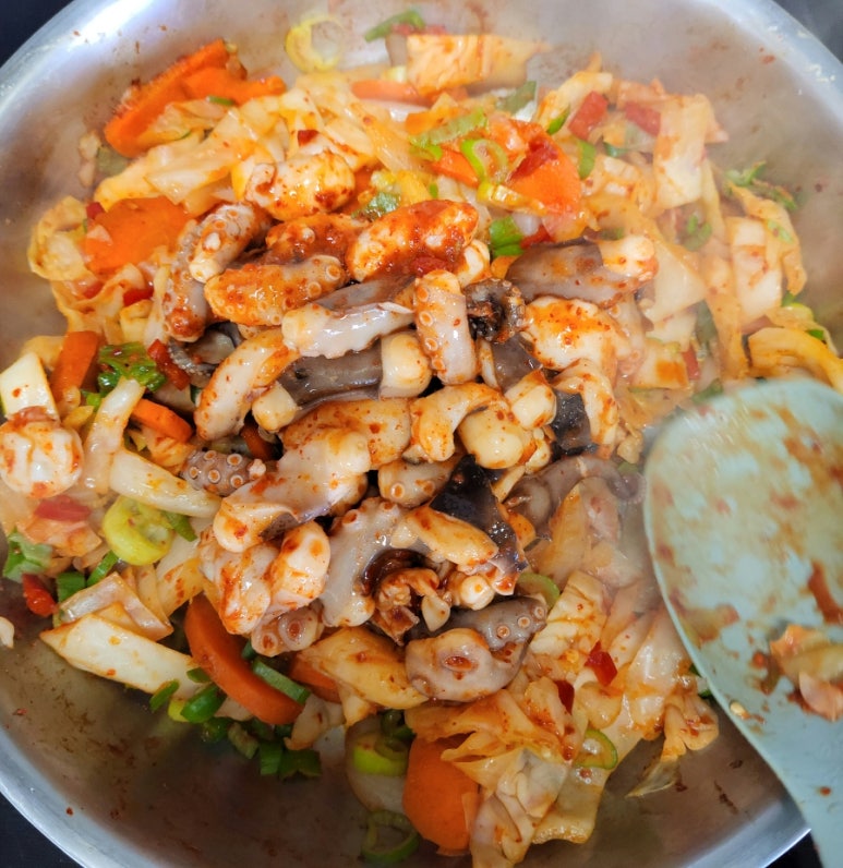 17. 마지막으로, 양념에 버무려둔 낙지를 넣고 빠르게 볶기. (강불, 1분)