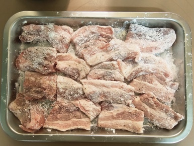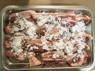 이제 잘 재워진 삼겹살에 전분가루를 양면에 골고루 입혀준다