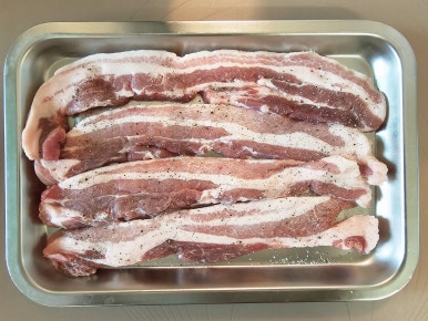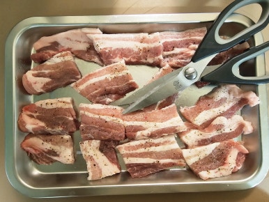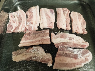 삼겹살 4줄(300~500g)을 해동시켜주고 소금과 후추를 뿌려 밑간을 해준 다음 상온에서 15~20분 재워둔다