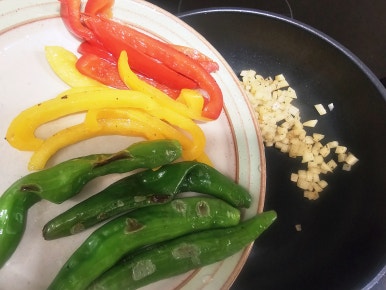 잘 볶아진(구워진) 파프리카와 꽈리고추를 따로 접시에 담아두고 볶은 감자에 물 3컵을 넣고 감자가 완전히 익도록 5분정도 끓여준다