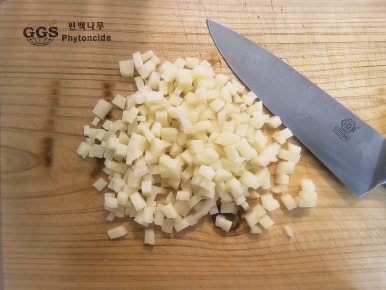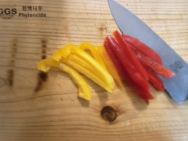 감자는 새끼 손톱 크기 정도로 깍둑썰기 해주고 파프리카는 대충 길게 썰어서 준비해준다