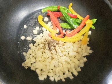 버터 1숟가락을 녹여주고 준비해둔 감자, 파프리카, 꽈리고추를 넣어주고 소금 한꼬집, 후추 살짝 뿌려서 굽는다 생각하고 열씨미 볶아준다
