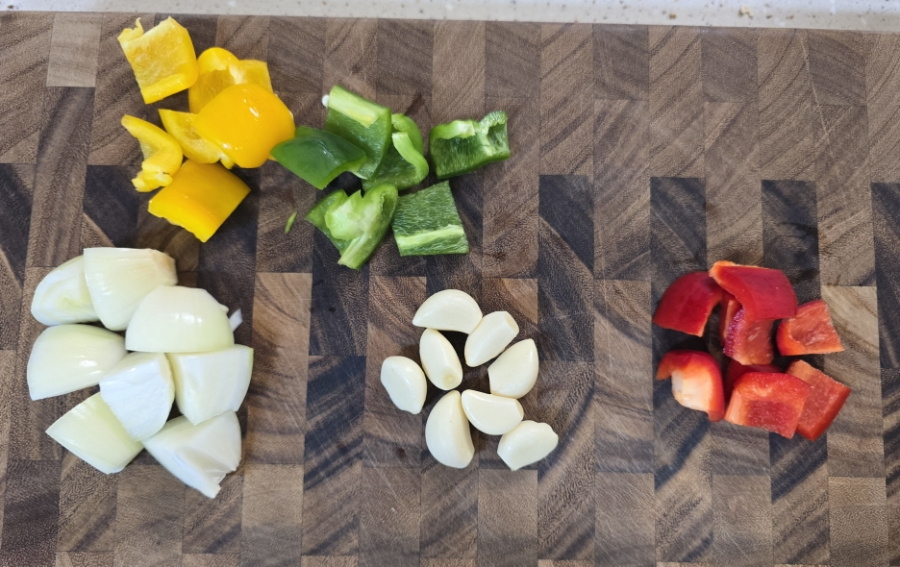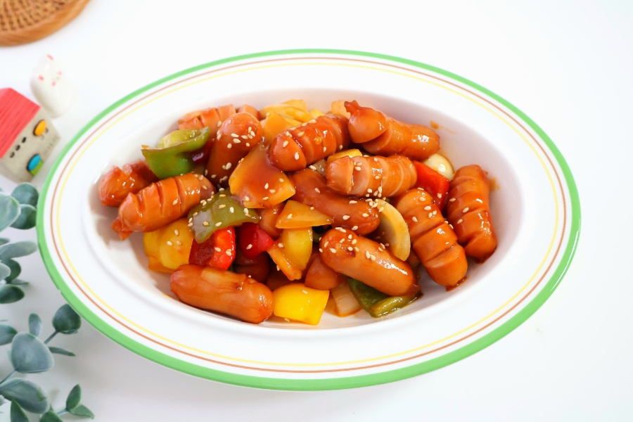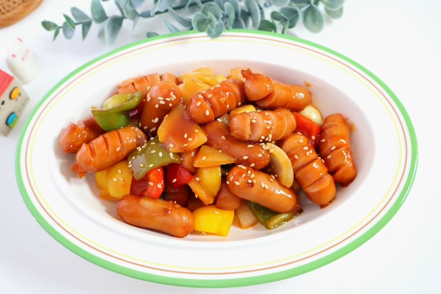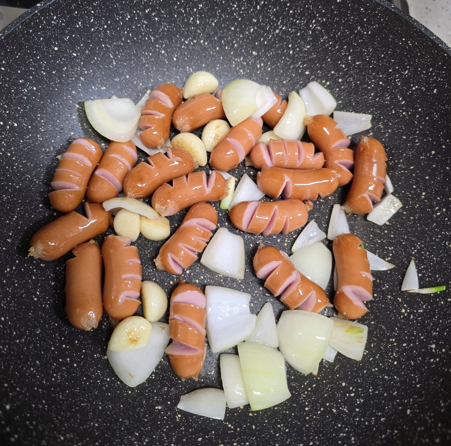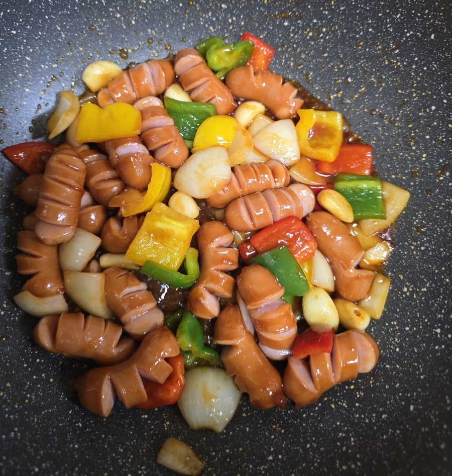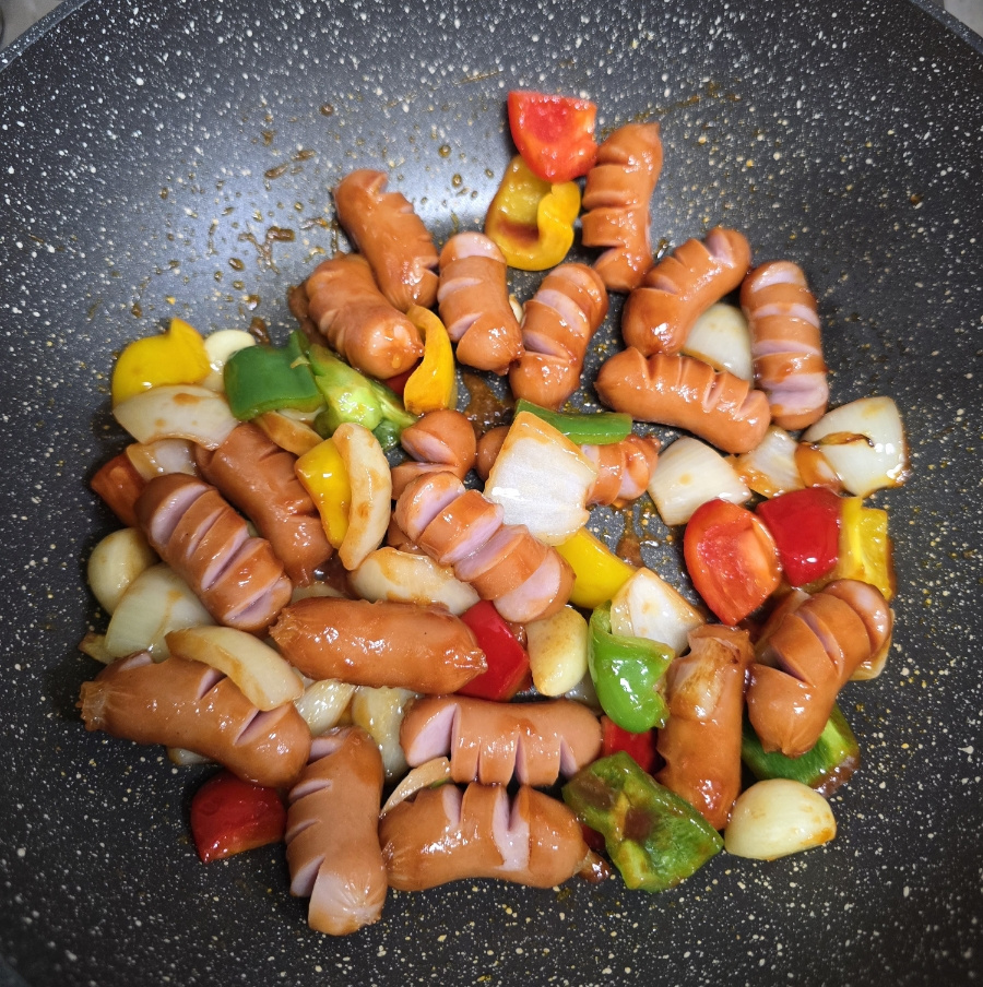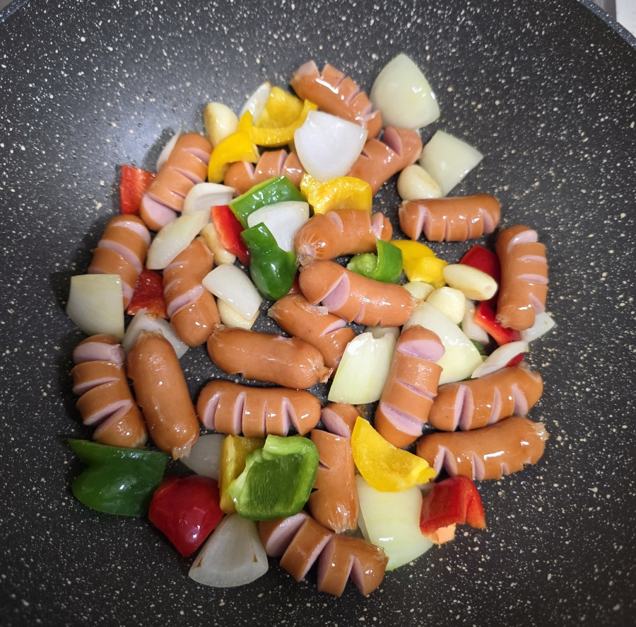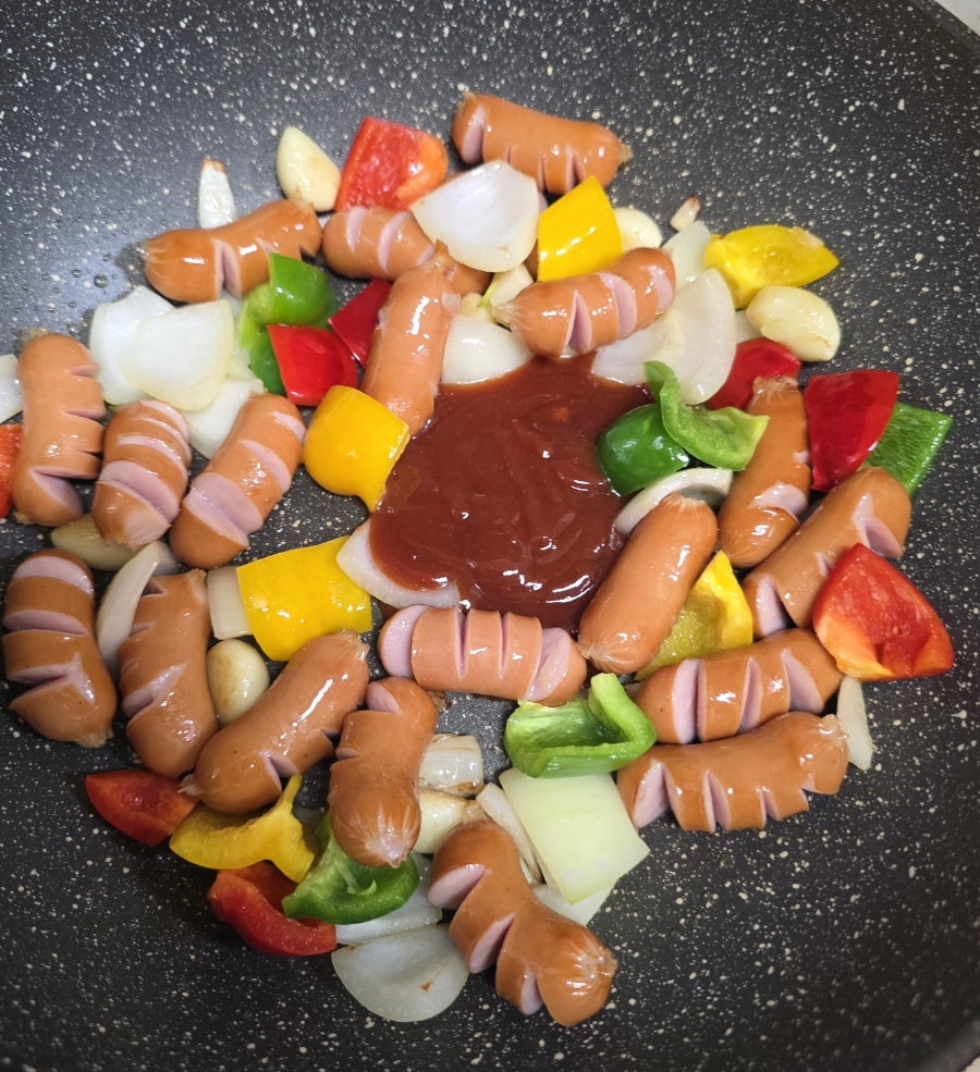 - 비엔나소시지 300g 양파 반개 파프리카 빨강 노랑 초록 1/4개 마늘 8쪽 식용유 적당히 물엿 한 바퀴 통깨 약간 , 양념 : 케첩 3 굴 소스 0.5 설탕 0.5 발사믹 식초 0.5(레몬수 식초) 생강가루 약간 , 계량 : 밥숟가락