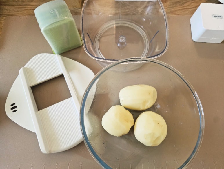 깨끗하게 손질한 감자 3개와 채칼을 준비해준다