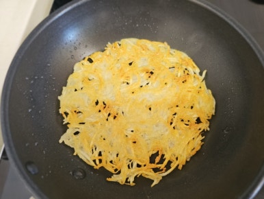 기름을 넉넉히 부어주고 반죽한 감자채를 한숟가락 크게 떠서 골고루 펴준 후 노릇노릇하게 구워준다