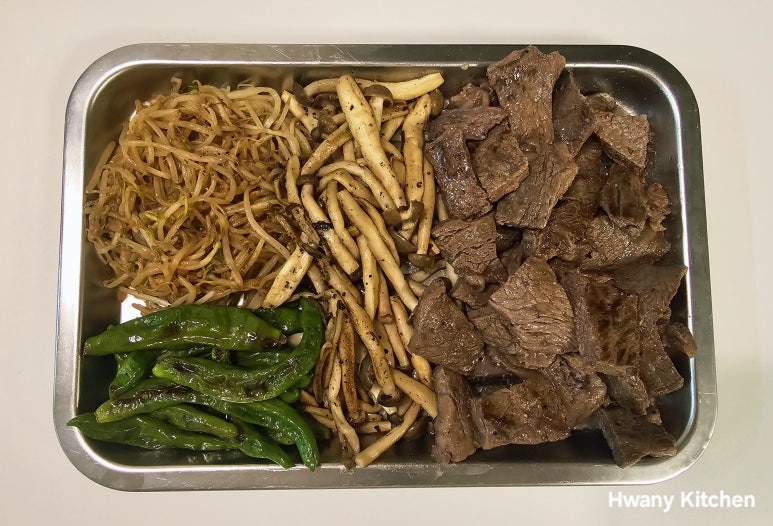 주재료 : 등심, 샐러드용 야채, 양송이, 방울토마토, 통마늘, 양파, 꽈리ㅣ고추