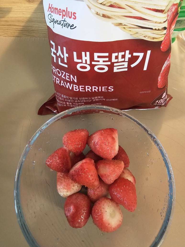 2잔을 만들거니깐 냉동딸기는 밥그릇 기준 2그릇만큼 해동시켜준다