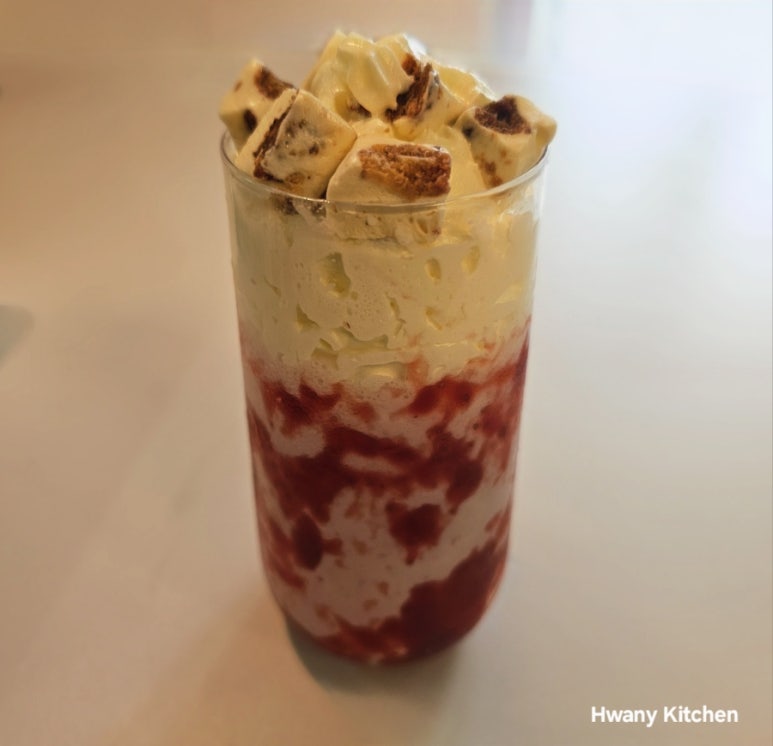 주재료 : 냉동딸기, 설탕, 올리고당, 휘핑크림, 쫀득딸기(CU편의점 트위젤 제품)