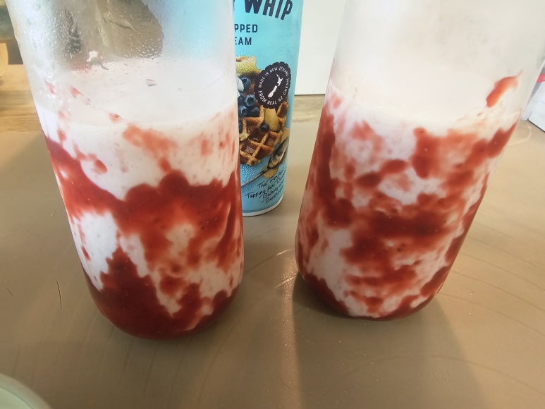 남은 딸기즙에 우유를 1 : 1 비율로 넣어주고 얼음 1컵을 넣고 믹서기로 신나게 갈아준다