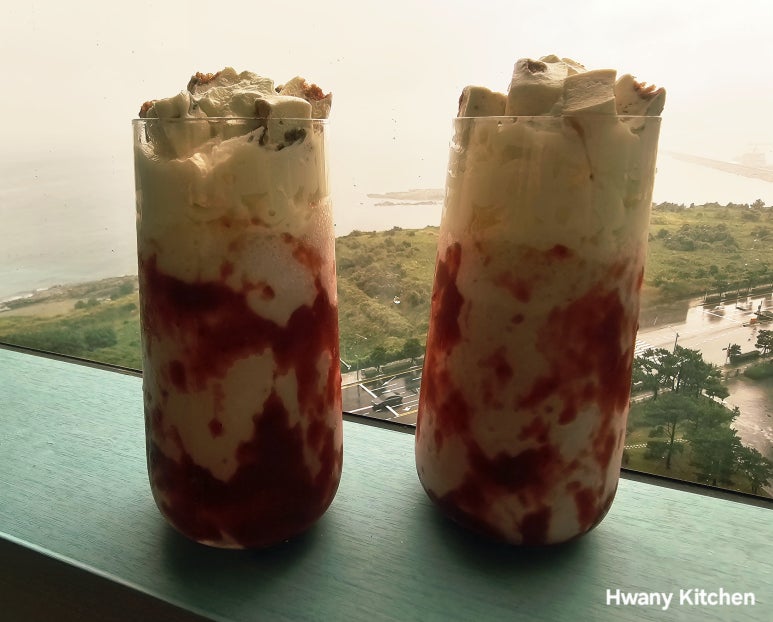 만들어진 딸기시럽은 유리컵 벽면에 성의없는듯 성의있게 발라주고 잠시 냉장고에서 식혀준다