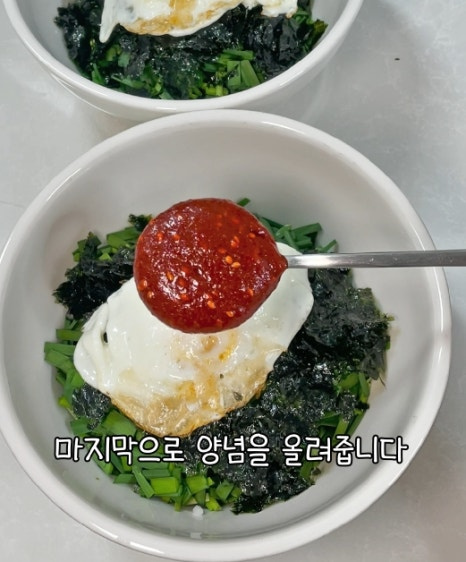 신선한 부추의 향과 고소한 조미김! 반숙 계란프라이와 부추비빔밥의 완성인 양념장 까지!