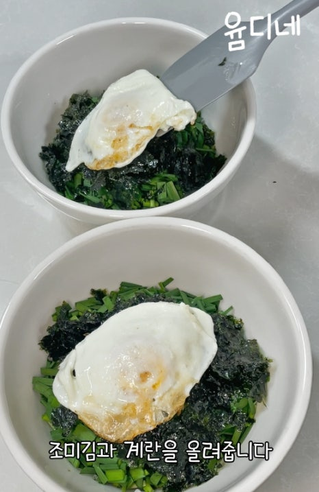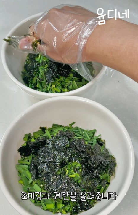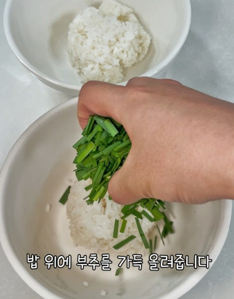 밥 위에 송송 썰어둔 부추를 올려준 뒤 그 위에 조미김을 부숴 올려줍니다!