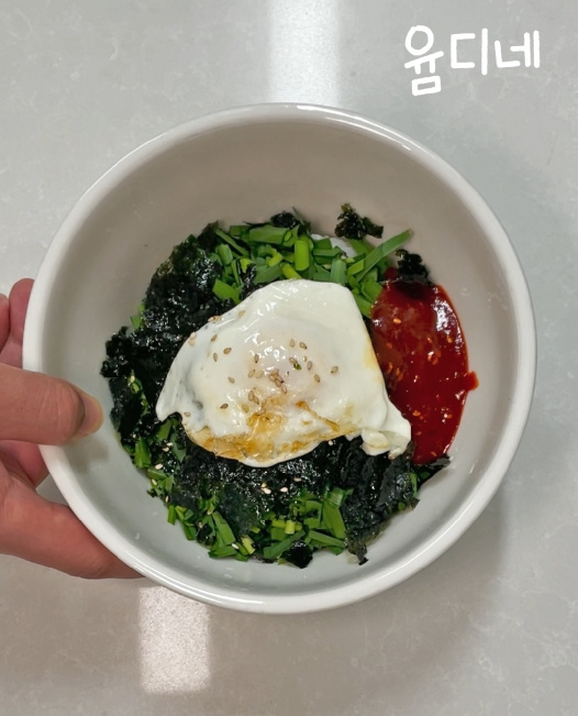 부추 1/4단 , 조미김 2봉지 , 계란프라이 2개 , 밥 한 공기