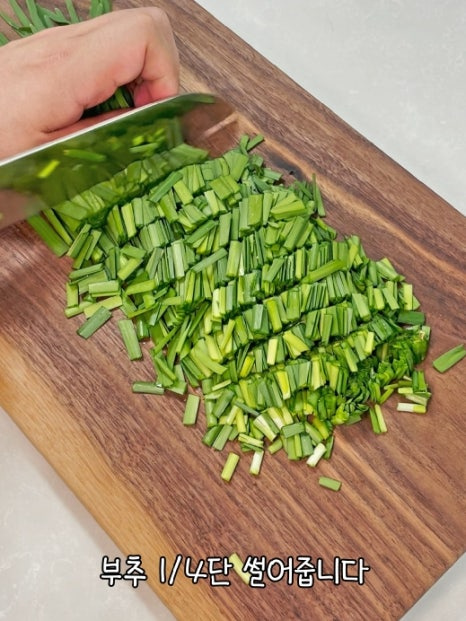 부추는 1/4단 정도 준비해서 가위로 썰어주시거나 칼로 먹기좋게 송송송 잘게 썰어줍니다!