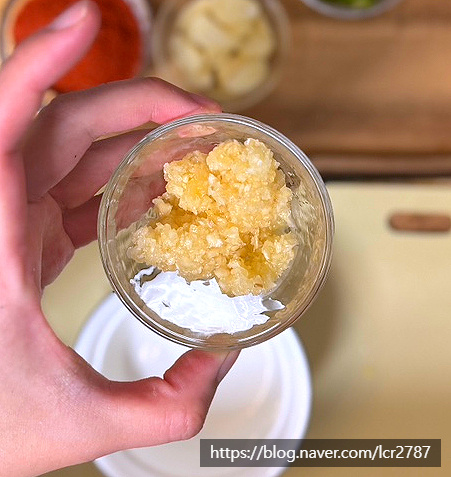 다대기 만들어 주세요.볼에 돼지 육수 3, 고춧가루 2, 새우젓 0.5 다진 마늘 0.5 넣고 섞어주세요.