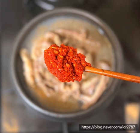 그 위로 돼지 육수를 붓고 다데기 1, 들깨가루 1 넣어주세요.