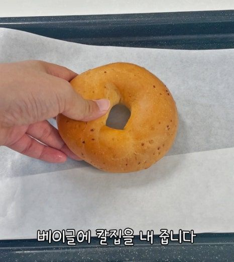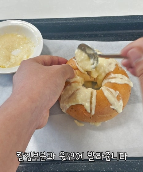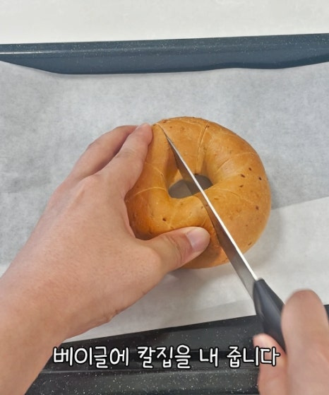 베이글 윗면에 칼집을 내 줍니다. 6등분이 되도록 썰어주시면 됩니다