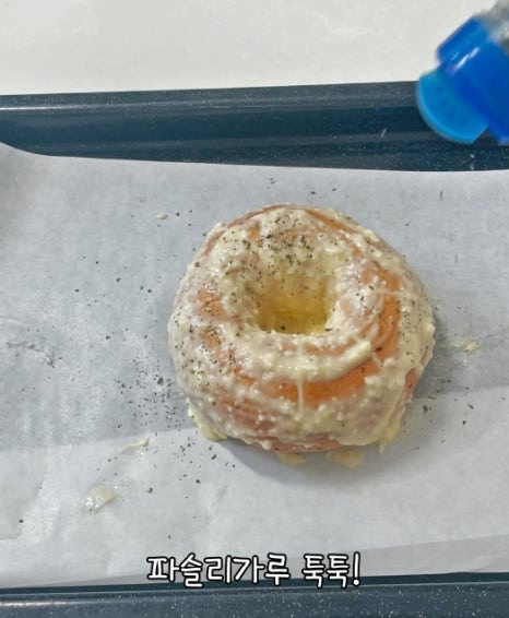 파슬리 가루를 올려서 감성도 살려준 다음에 오븐에 먼저 190도 예열을 마친 뒤 180도로 내려 10분에서 12분 정도 구워줍니다.