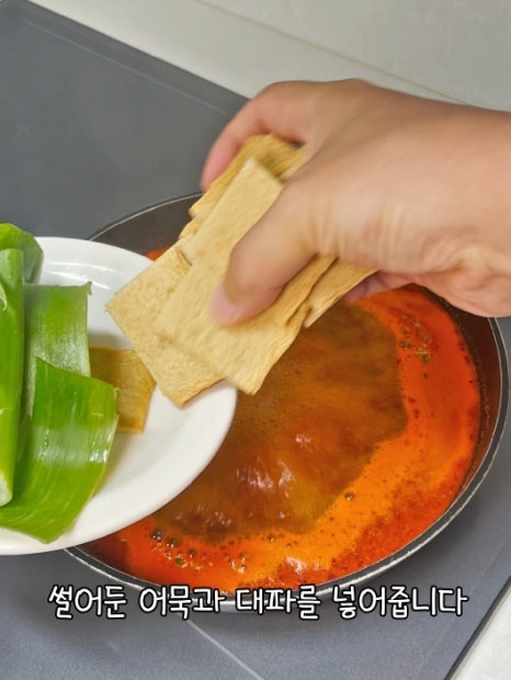 썰어둔 어묵과 대파, 냉동만두를 넣고 보글보글 끓여줍니다.