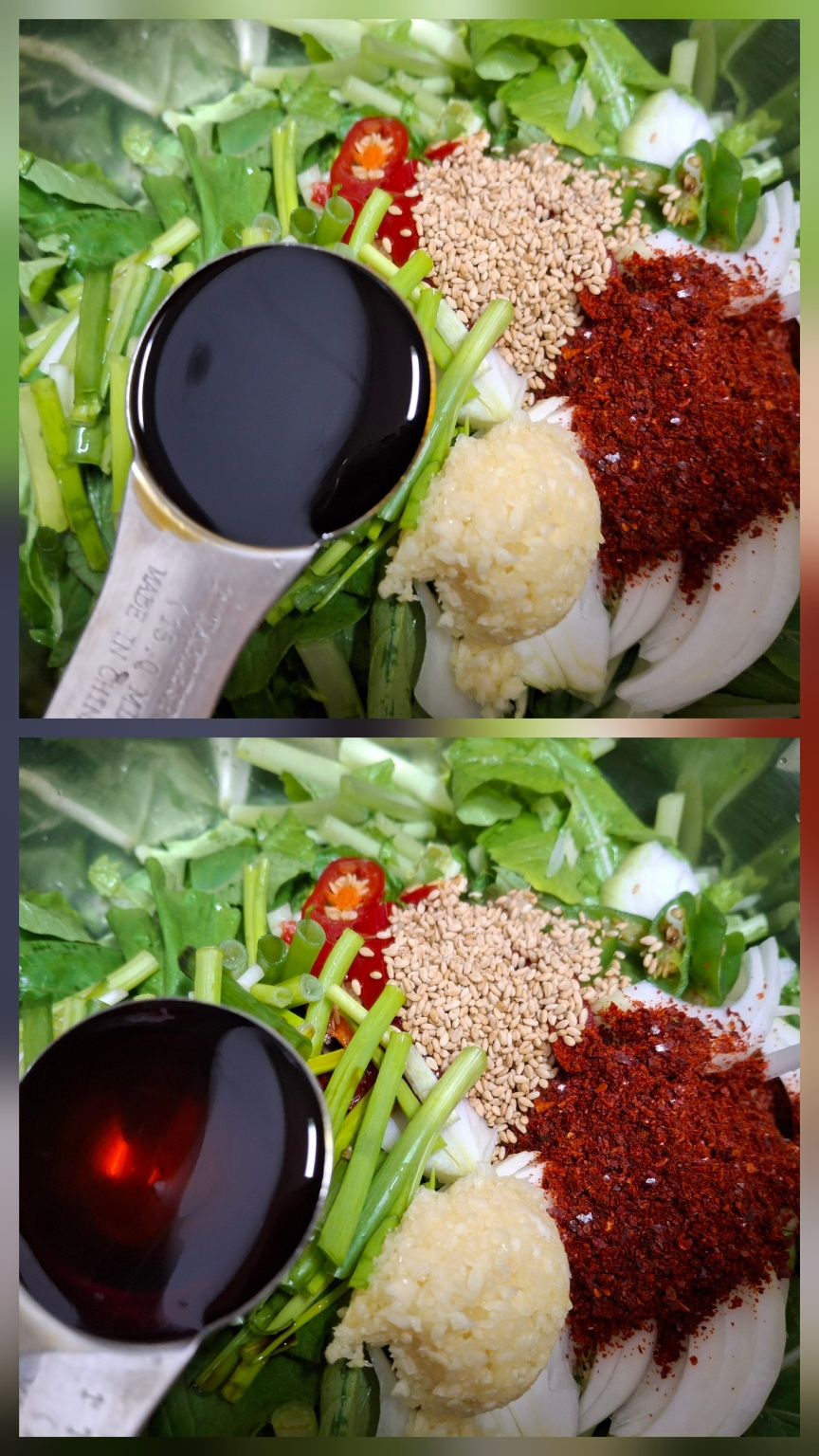 간장 1큰술, 까나리액젓 3큰술, 매실액 1큰술, 사과식초 2/3큰술