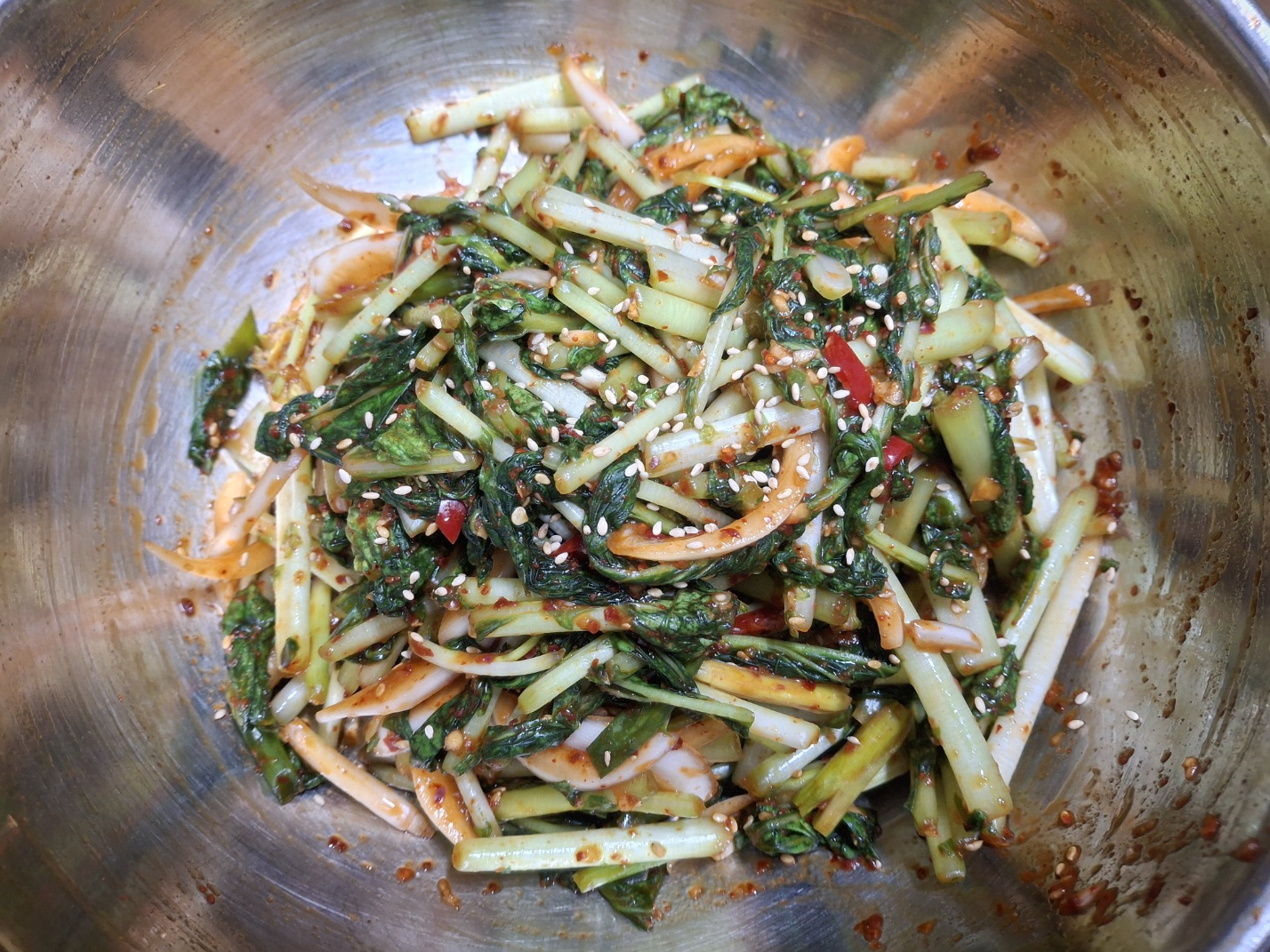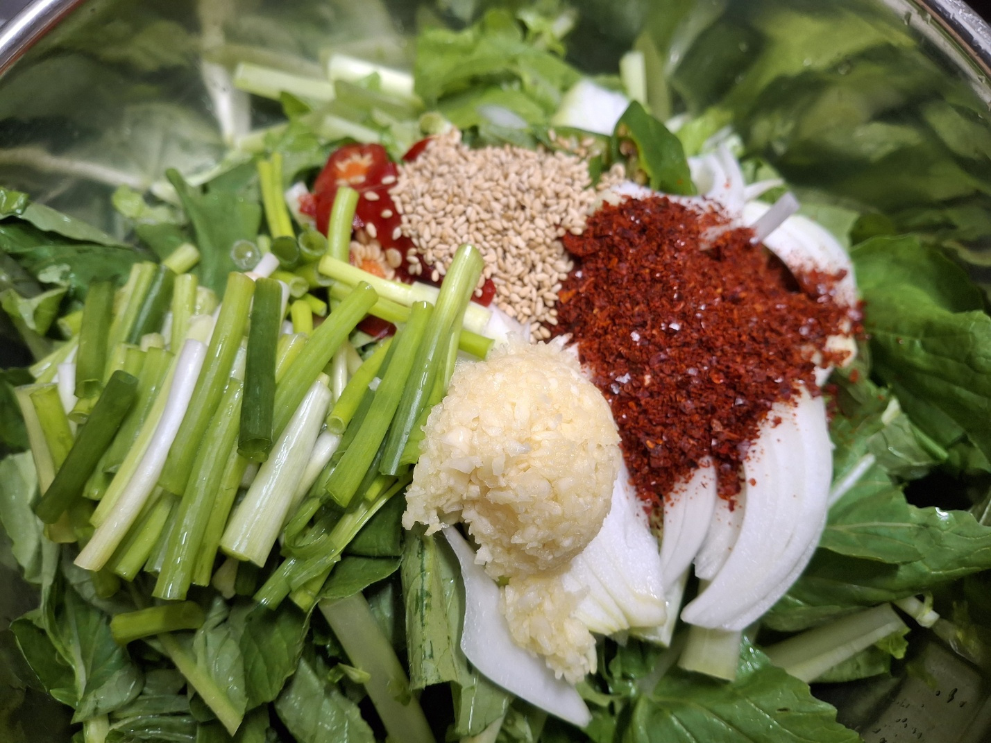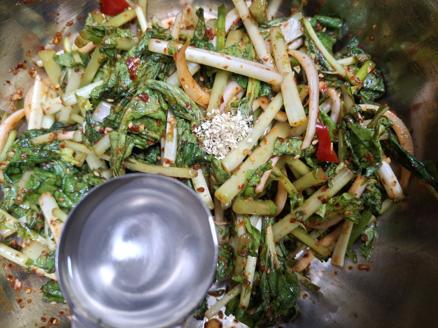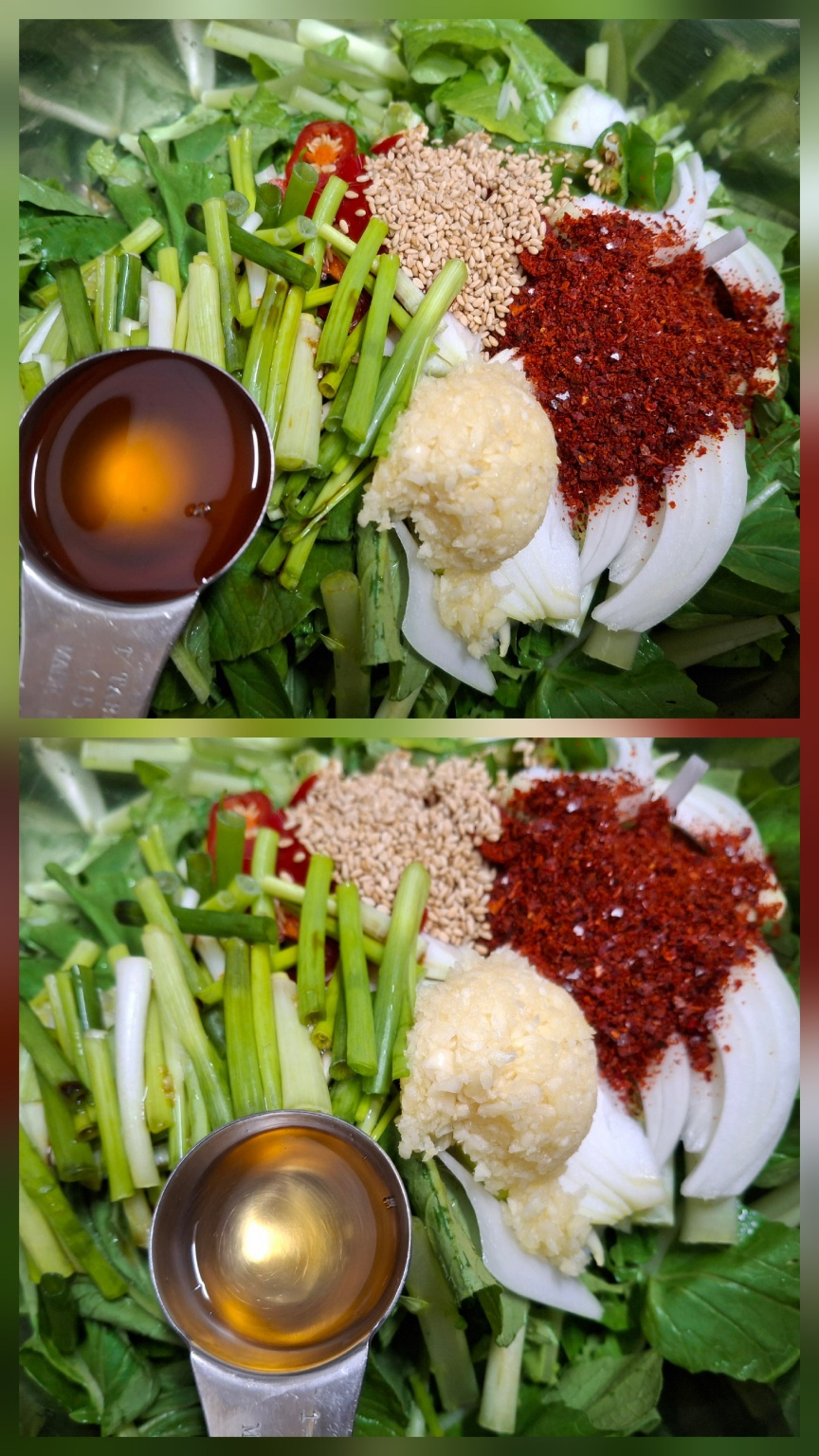 고춧가루 3큰술, 다진 마늘 1큰술, 통깨 1큰술