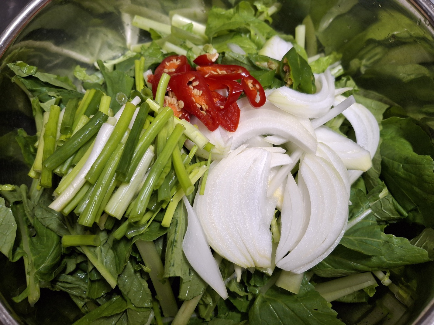 양파 100g, 쪽파 5줄기, 청양고추 1개, 홍고추 1개